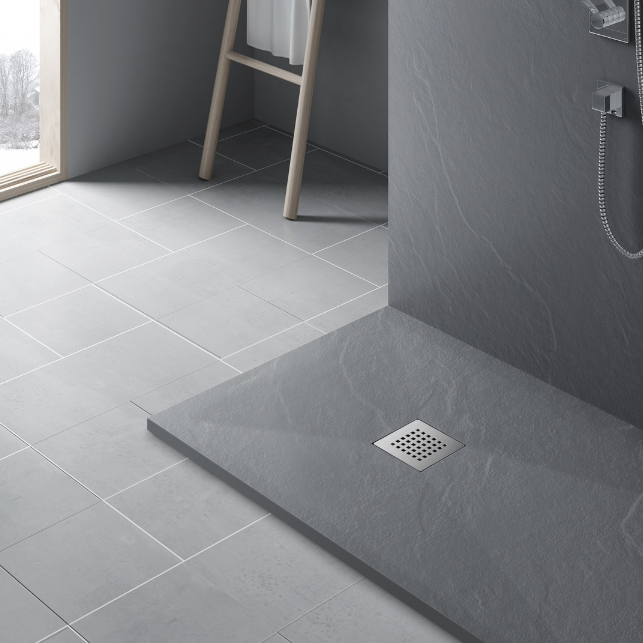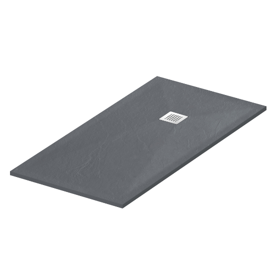 Balneo Stone Tray brodzik prostokątny 80x100x2,5cm, ciemnoszary STFDG8010025, wykonany z kompozytu mineralnego, kolor ciemnoszary ze strukturą kamienia, długość 1000 mm, szerkość 800 mm, wysokość 25 mm, otwór odpływy o średnicy 90 mm, sposoby montażu: bezpośrednio na posadzce  i na równi z posadzką. Konstrukcja brodzika pozwala na jego dopasaowanie poprzez przycięcie.