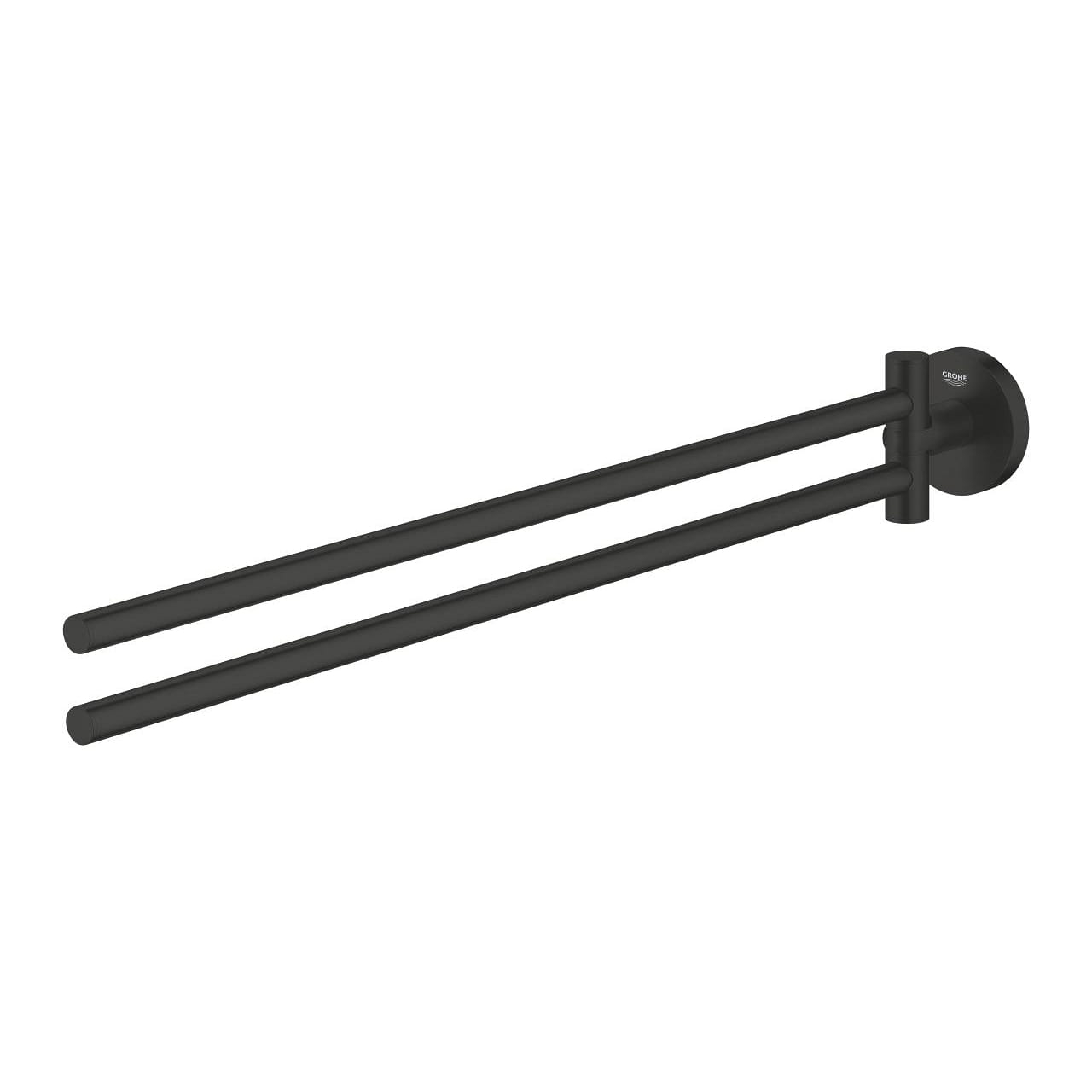 GROHE Essentials wieszak dwuramienny, matte black 1024672430, kolor czarny mat, trwała powłoka z GROHE Long-Life, wykonany z metalu, montaż ścienny na kołkach z wkrętami, dwa obrotowe ramiona, długość 439 mm.