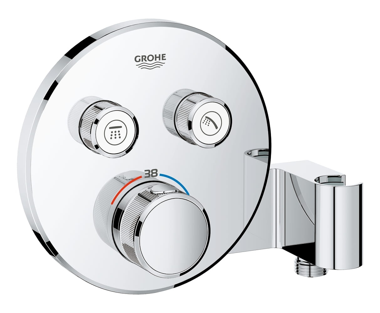 Grohe Grohtherm SmartControl bateria z termostatem do obsługi dwóch odbiorników wody 29120000ze zintegrowanym przyłączem i uchwytem prysznicowym, przeznaczona do montażu gotowego z elementem podtynkowym Rapido SmartBox, metalowa rozeta ścienna z GROHE QuickFix (zakryte uszczelnienie rozety i mocowania trzpienia), regulacja 6°, GROHE StarLight powłoka chromowa, przełącznik SmartControl, regulacja przepływu wody: od oszczędnego EcoJoy do pełnego Full Flow, wymienne symbole: wanna, prysznic, deszczownica, dysze, GROHE TurboStat głowica termostatyczna, GROHE SafeStop blokada na 38°C, GROHE SafeStop Plus w zestawie opcjonalny ogranicznik temperatury 43°C / 46°C, wbudowane zawory zwrotne i sitka do, zanieczyszczeń, możliwość używania obu wyjść wody jednocześnie, zintegrowane kolanko prysznicowe z wyjściem ½", wydajność przepływu: wyjście B = 24 l / min, słuchawka prysznicowa = 12 l / min,n.