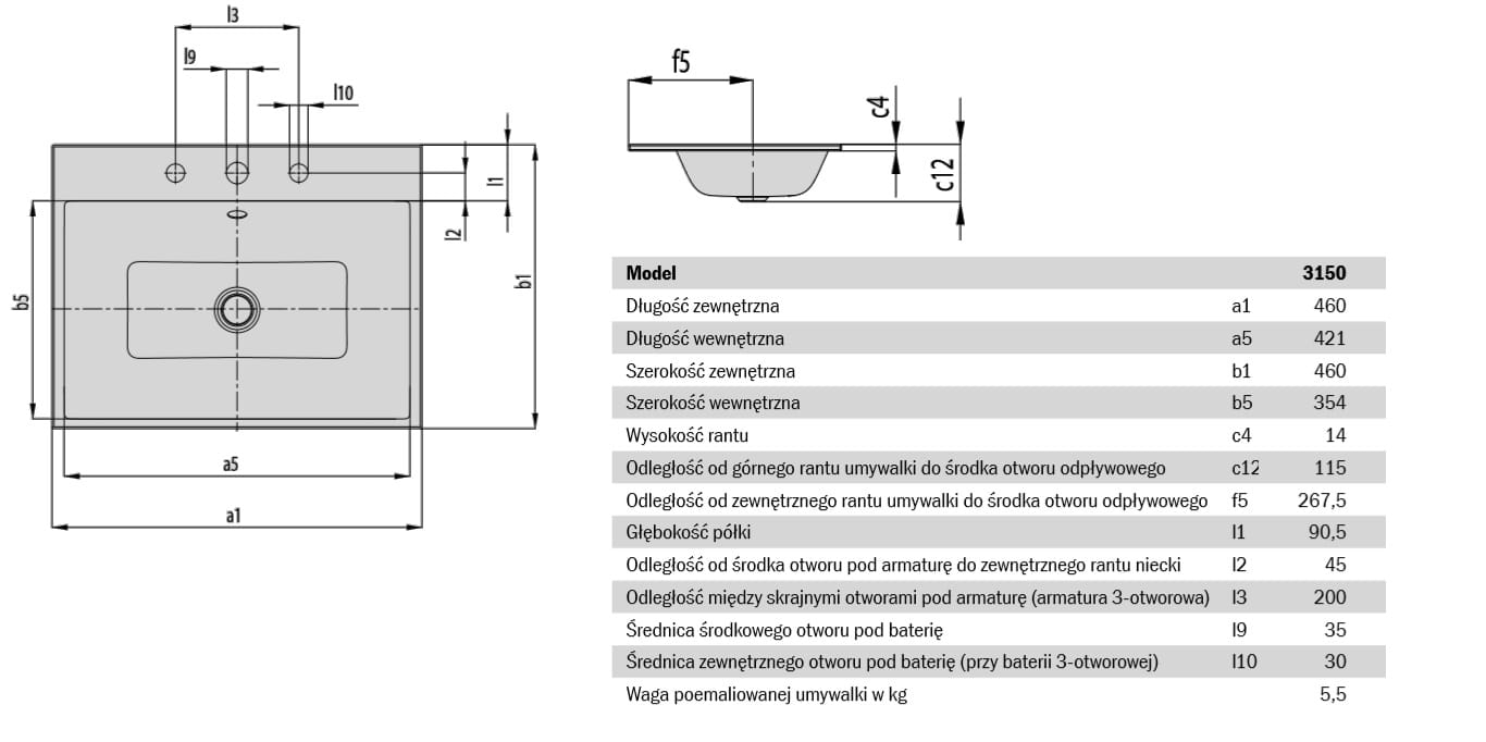 Kaldewei Puro umywalka wpuszczana w blat 46x46cm model 3150, 9000.0601.3001, kolor biały, wanna wykonana z blachy stalowej emaliowanej o grubość 3,5 mm, długość 460 mm, szerokość 460 mm, z jednym otworem na baterię, z przelewem, z powierzchnią uszlachetnioną i matami wygłuszającymi, obustronnie emaliowana.