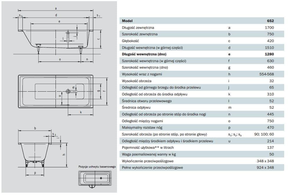 Kaldewei Puro wanna prostokątna 170x75 cm model 652 2562.0001.0001, kolor biały, jednoosobowa wanna z odpływem umieszczonym po stronie stóp, klasyczny kształt czworokątny, wanna wykonana z blachy stalowej emaliowanej o grubość 3,5 mm, długość 1700 mm, szerokość 750 mm, głębokość 420 mm, pojemność użytkowa 137 litrów. Do montażu zalecamy stosowanie nóżek Kaldewei model 5037.