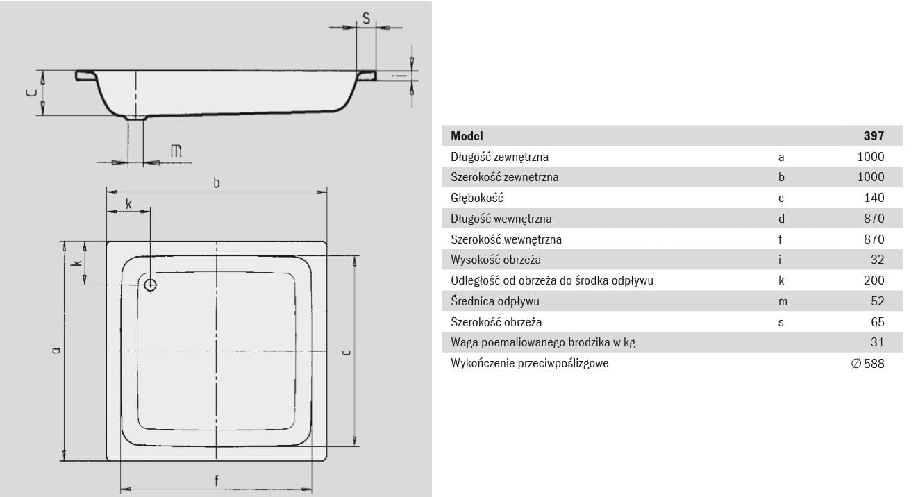 Kaldewei Sanidusch brodzik kwadratowy 100x100x14cm model 397 4407.0001.0001, kolor biały, wykonany ze stali emaliowanej o grubości 3,5 mm, długość 1000 mm, szerokość 1000 mm, głębokość 140 mm, średnica odpływu 52 mm.