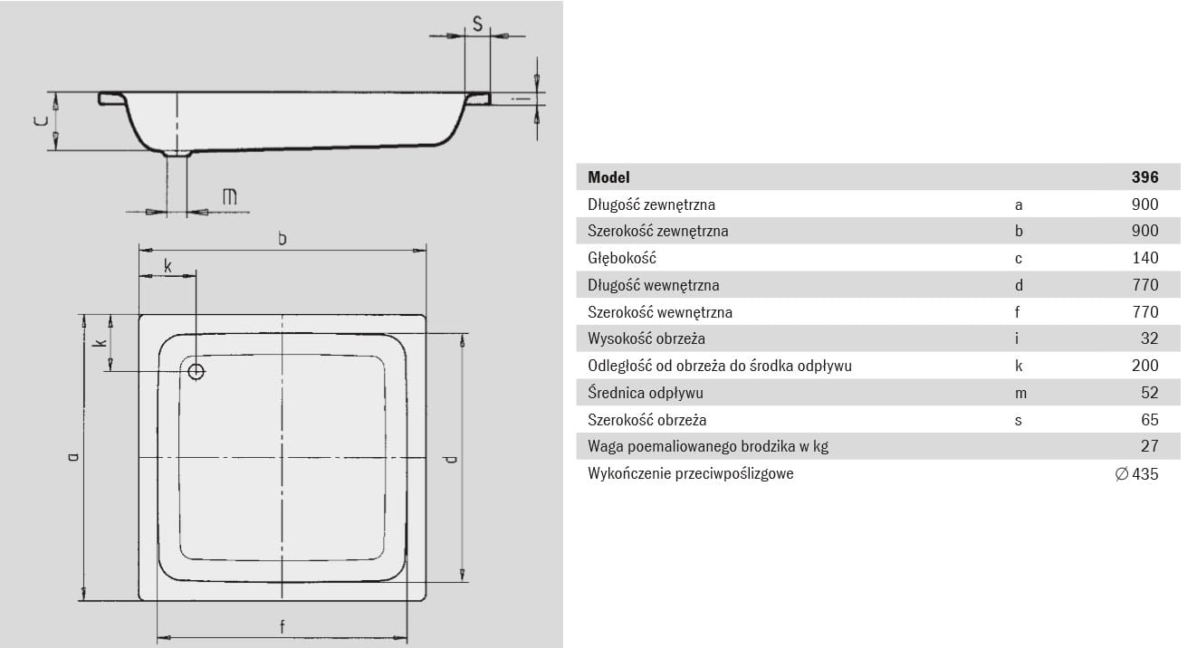 Kaldewei Sanidusch brodzik kwadratowy 90x90x14cm model 396 3311.0001.0001, kolor biały, wykonany ze stali emaliowanej o grubości 3,5 mm, długość 900 mm, szerokość 900 mm, głębokość 140 mm, średnica odpływu 52 mm. Do montażu niezbędne nogi model 5200, które prezentujemy w zakładce produkty powiązane.