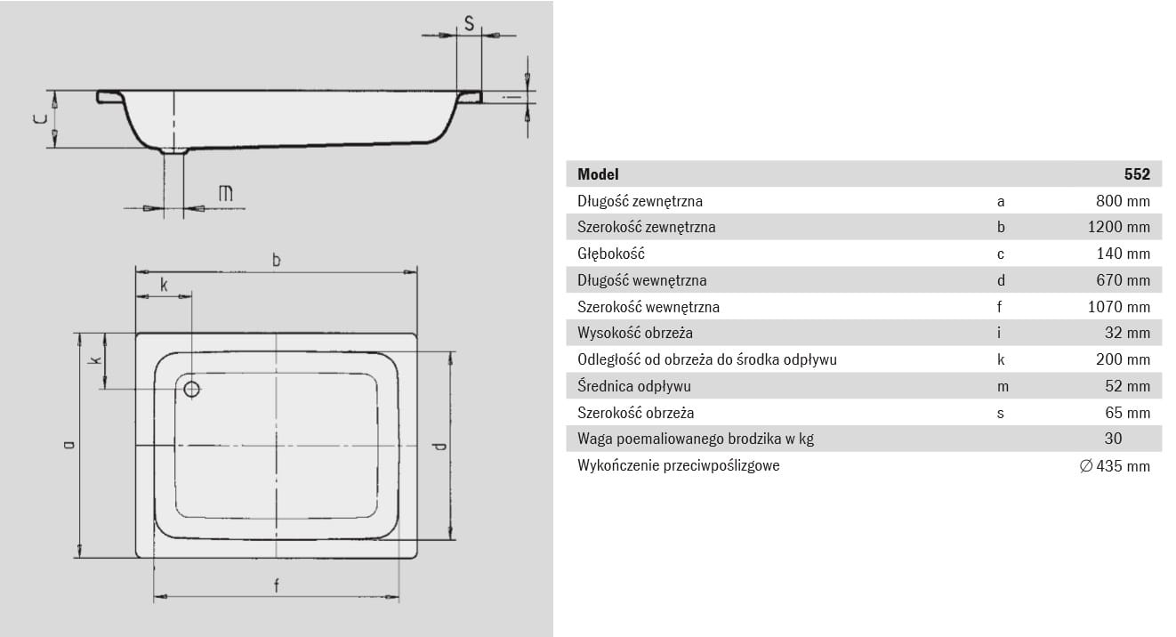 Kaldewei Sanidusch brodzik prostokątny 80x120x14cm model 552 4483.0001.0001, kolor biały, wykonany ze stali emaliowanej o grubości 3,5 mm, długość 800 mm, szerokość 1200 mm, głębokość 140 mm, średnica odpływu 52 mm. Do montażu niezbędne nogi model 5200, które prezentujemy w zakładce produkty powiązane.
