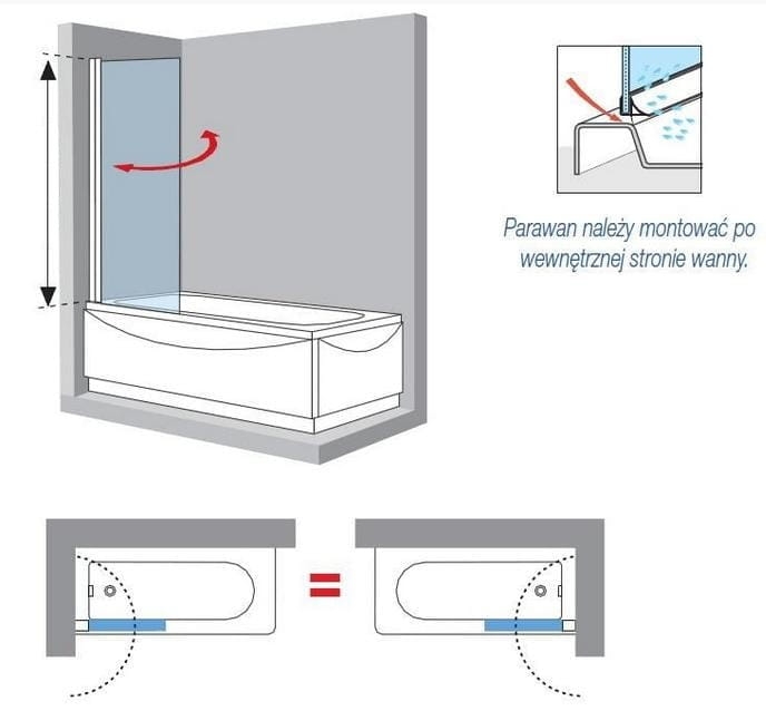 Novellini Aurora 1 parawan nawannowy jednoczęściowy na wymiar, profil biały, szkło bezbarwne AURORAN1SP-1K, profil biały połysk, szkło bezbarwne o grubości 6 mm z powłoką CRYSTALCLEAR - szkło Novellini poddawane jest specjalnemu procesowi nakładania powłoki Crystal Clear, która utrudnia zatrzymywanie się na powierzchni kropel wody, przez co znacznie redukuje powstawanie kamienia i bakterii na szkle, możliwość zamówienia wysokości 1000 - 1500 mm, możliwość zamówienia o szerkości 450 - 1000 mm, składanie na zewnątrz i do wewnątrz, montaż uniwersalny lewy / prawy.