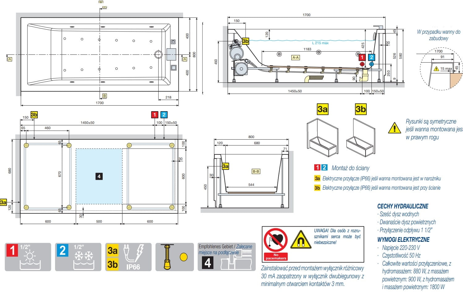 Novellini Calos 2.0 wanna prostokątna 170x80cm C2117080-A, wersja do zabudowy, kolor biały połysk, wykonana z akrylu sanitarnego, długość 1700 mm, szerokość 800 mm, głębokość 425 mm, pojemność ok 190 litrów.