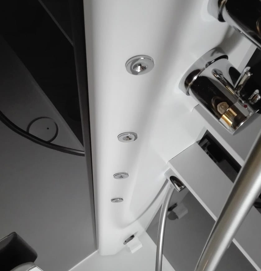 - panel prysznicowy, wyposażony w baterię termostatyczną oraz przełącznikiem w postaci zaworu obrotowego, którym można wybrać jeden z trzech odbiorników: deszczownica, która jest zamontowana w pokrywie kabiny, dysze masażowe, rączka prysznicowa, montowana na regulowanym uchwycie prysznicowym z regulowaną wysokością. Dodatkowym wyposażeniem jest dotykowy, elektroniczny panel sterowania, który umożliwia uruchomienie: kąpieli parowej, kolorowego oświetlenia LED oraz odtwarzacza bluetooth dzięki któremu, podczas kąpieli, można słuchać ulubionej muzyki ze smartfona.