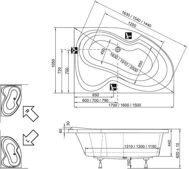 Ravak Rosa II wanna akrylowa asymetryczna 150x105cm, prawa CJ21000000, kolor biały, długość 1500 mm, szerokość 1050 mm, głębokość 440 mm, pojemność 260 litrów, możliwość zastosowania stelaża montażowego, obudowy do wanny, parawanu nawannowego, zagłówka oraz uchwytu wannowego. Produkty te przedstawiamy w zakładce" produkty powiązane".