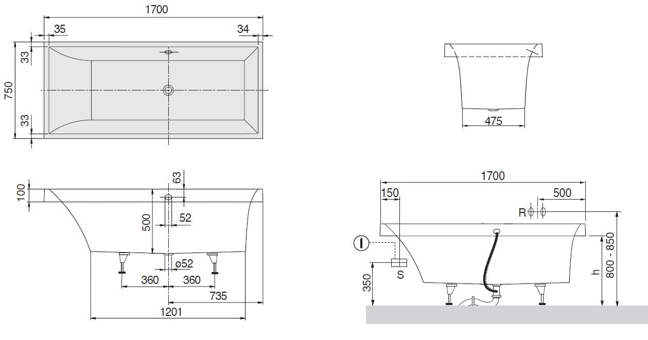 Villeroy&Boch Squaro wanna prostokątna 170x75 cm BQ170SQR2V-01, kolor biały, wanna wykonana z Quaryl ® Villeroy&Boch o grubości do 18 mm, długość 1700 mm, szerokość 750 mm, głębokość 500 mm, pojemność z jedną osobą 195 litrów, wysokość zabudowy 555 mm, waga 52 kg, nóżki w komplecie o zakresie regulacji 145 - 180 mm, wymaga przedłużonego systemu przelewowo-odpływowego, możliwość zastosowania zagłówka. Gwarancja 10 lat.